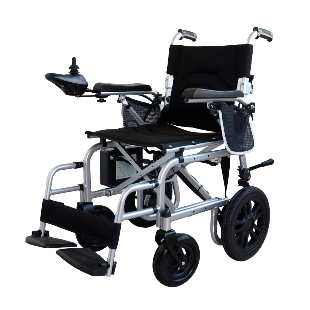 Esta silla de ruedas eléctrica fabricada en aluminio ultraligero y un diseño compacto la silla se dobla y se carga fácilmente para transportar a cualquier lugar.